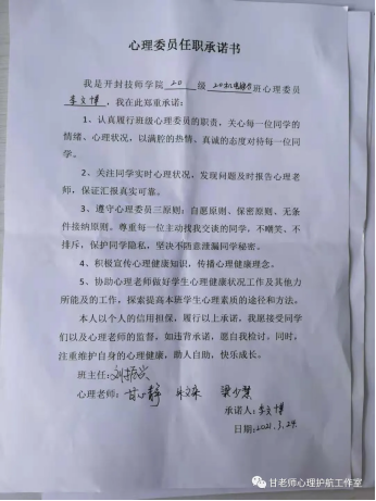 在选定心理委员后,心理委员签订“心理委员任职承诺书”,班主任签字。
