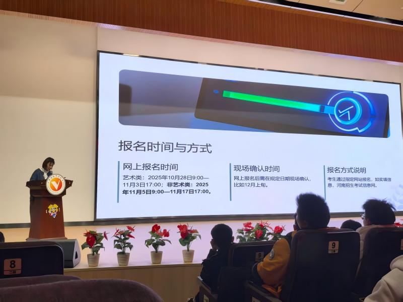 首先教学副主任王燕以“时光为舟,勤勉为桨”为主题,为同学们绘制了一张清晰明了的升学时间导航图。她不仅详细标注了报名、资格审核、考前准备、考试实施等关键时间节点,更贴心提醒了每个阶段需要注意的细节。“十一月是报名关键期,十二月要完成资格确认,明年四月要重点关注考试安排”。台下学子们或凝神聆听,或做好笔记,生怕错过任何一个重要信息。