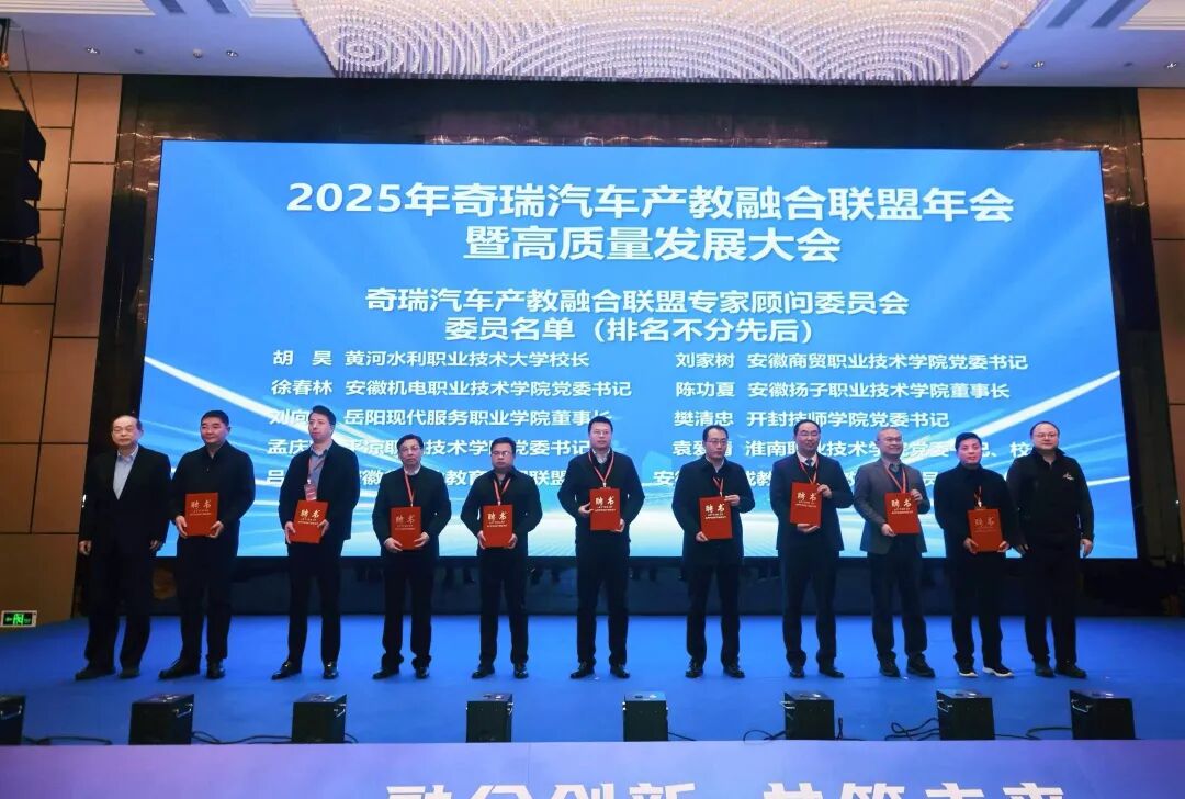 我院党委书记樊清忠、智慧交通学院院长张国青应邀出席会议。会上,我院凭借在产教融合、技能人才培养领域的突出表现,获评奇瑞汽车2025年度产教融合标杆院校。樊清忠被聘为奇瑞汽车产教融合联盟专家顾问委员会专家顾问。