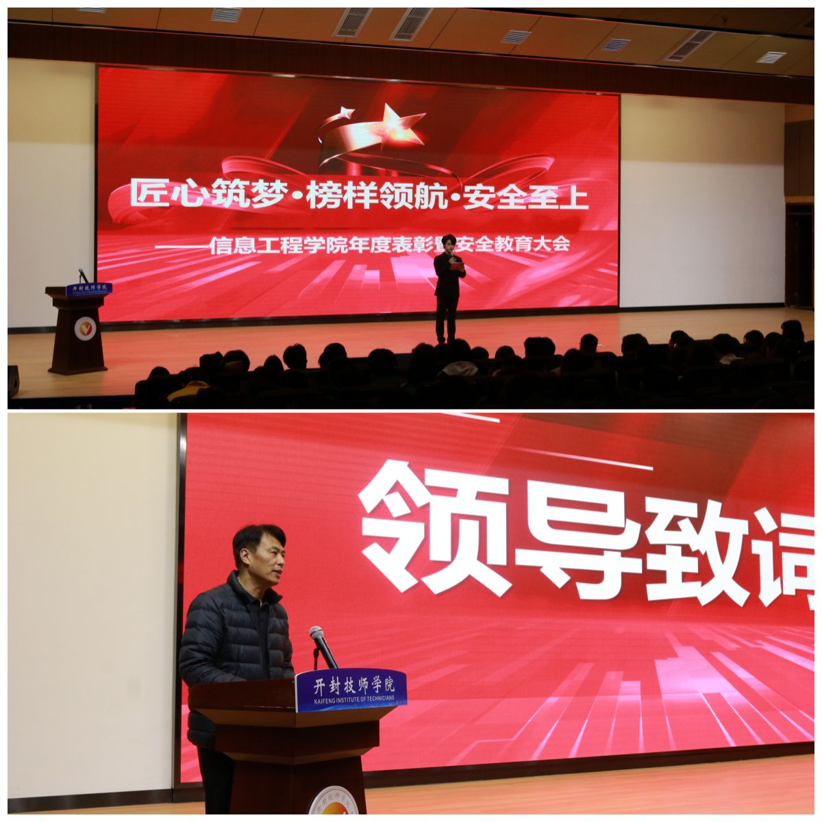 2026年3月25日下午,开封技师学院信息工程学院“匠心筑梦、榜样领航、安全至上”年度表彰暨安全教育大会隆重举行。开封技师学院副院长王志广,纪委书记梁伟,信息工程学院院长王亚昕,河南先途产业学院院长王博、李晓东,信息工程学院副院长孙方骏、雷蕊及信息工程学院全体师生齐聚一堂,共同见证荣耀时刻。