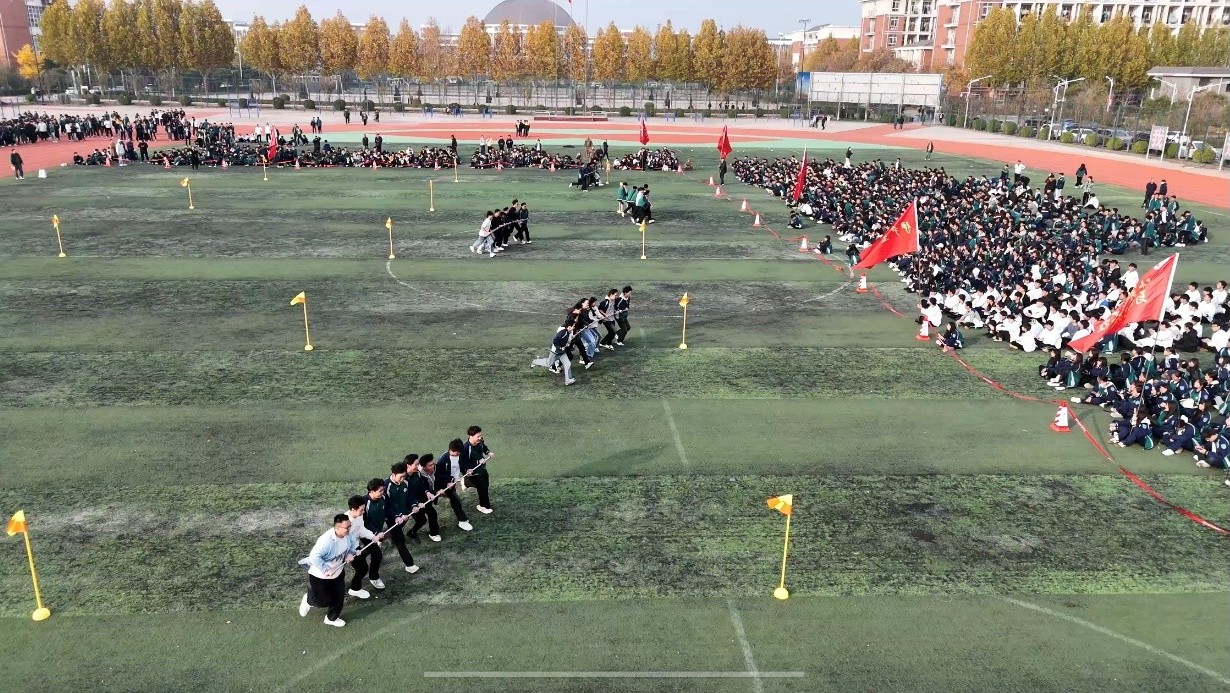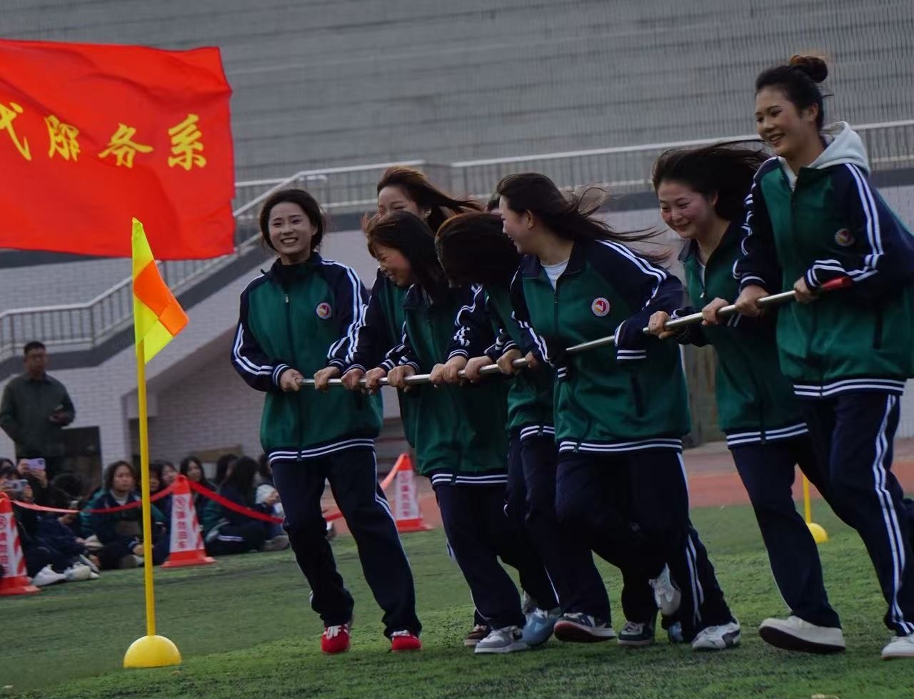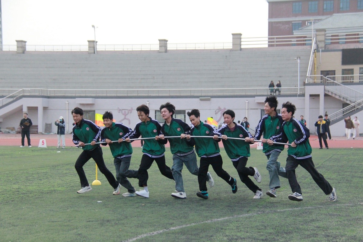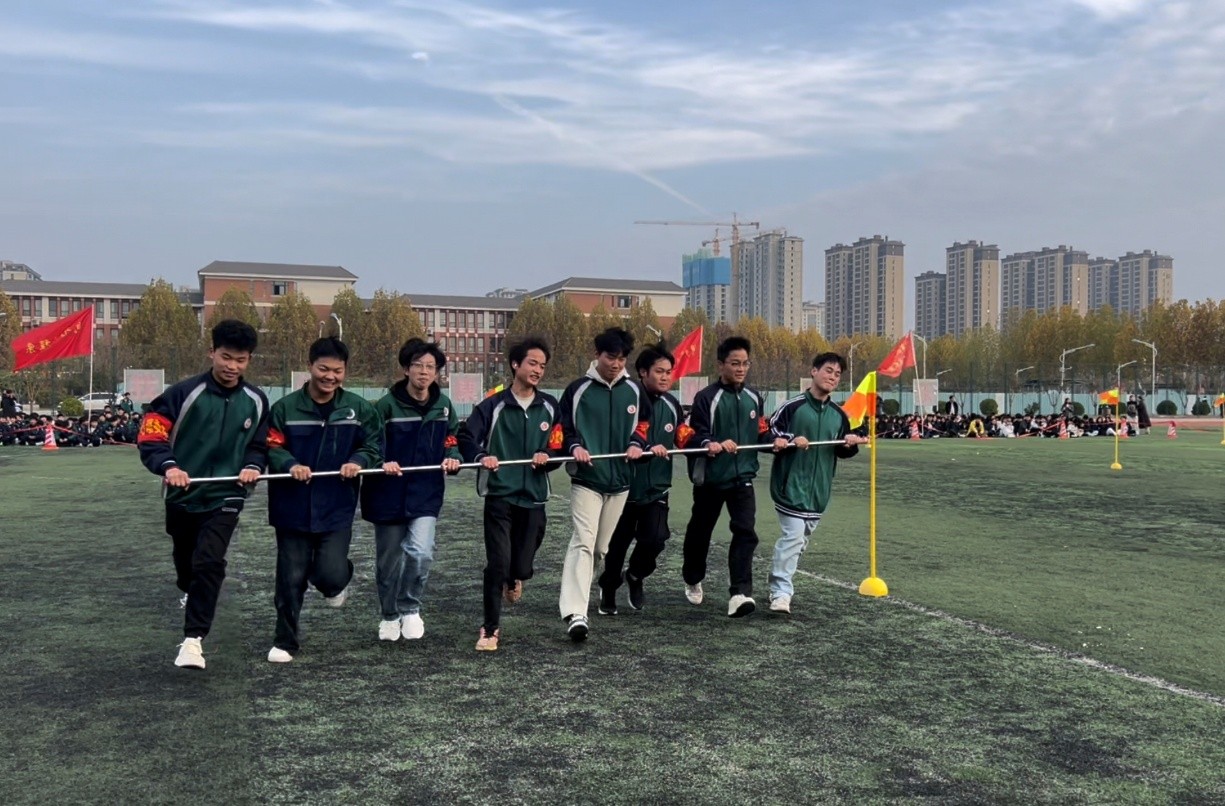 参赛的同学们和班主任一起手握横杆,团结协作,绕过旗杆,冲向终点。未参赛的同学自发当起啦啦队,加油声、欢笑声此起彼伏,赛场上瞬间欢腾值爆表。