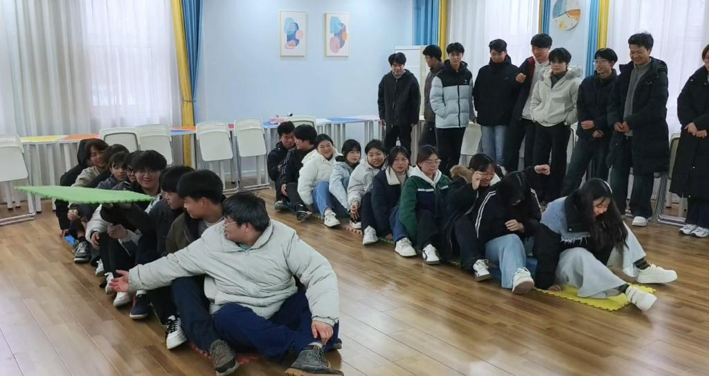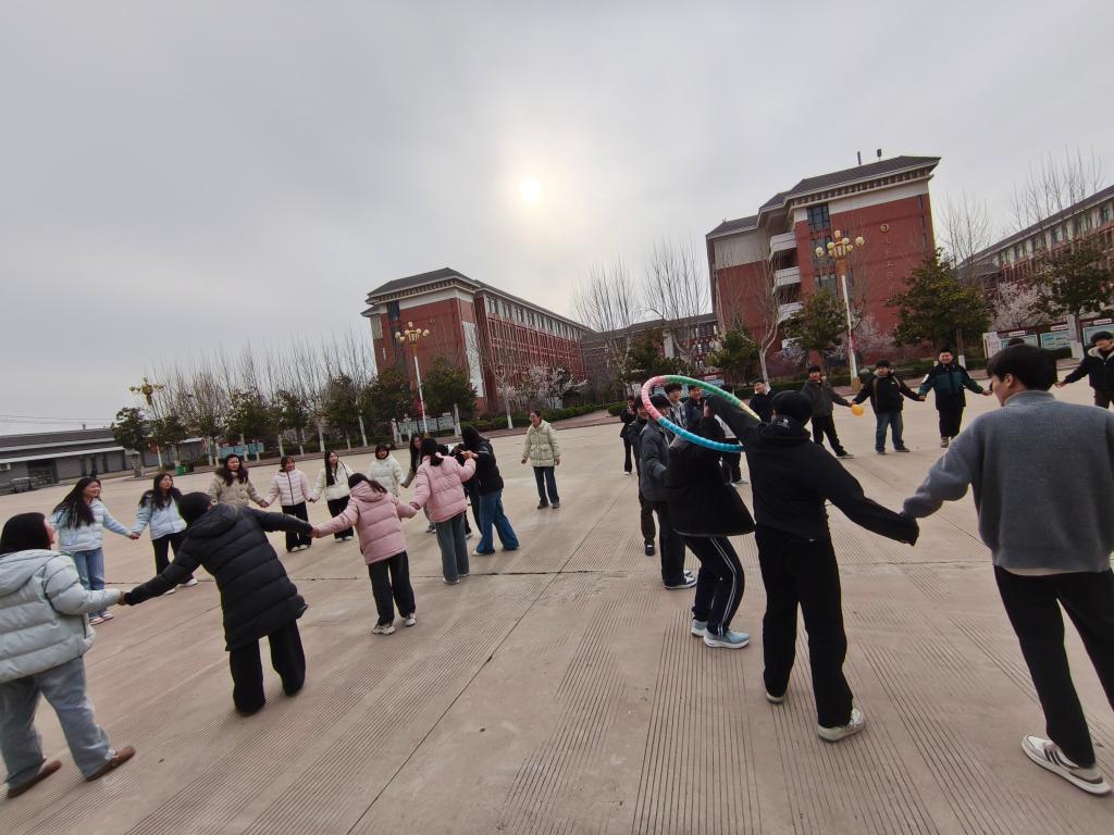接下来的团体辅导活动将培训氛围推向高潮。 “旱地龙舟”项目里,大家同乘“龙舟”,步调一致向前行进,在奋勇争先的比拼中,增强了团队的凝聚力与默契度。“开心背夹球”活动中,同学们两两结对、背靠背协作运球,在默契配合与接力比拼中,进一步提升了彼此的信任度与协同配合能力。“一圈到底”活动中,同学们手拉手围成圆圈,默契配合,通过身体的灵活扭动传递呼啦圈,在齐心协力完成挑战的过程中,培养了团队协作意识与沟通能力。